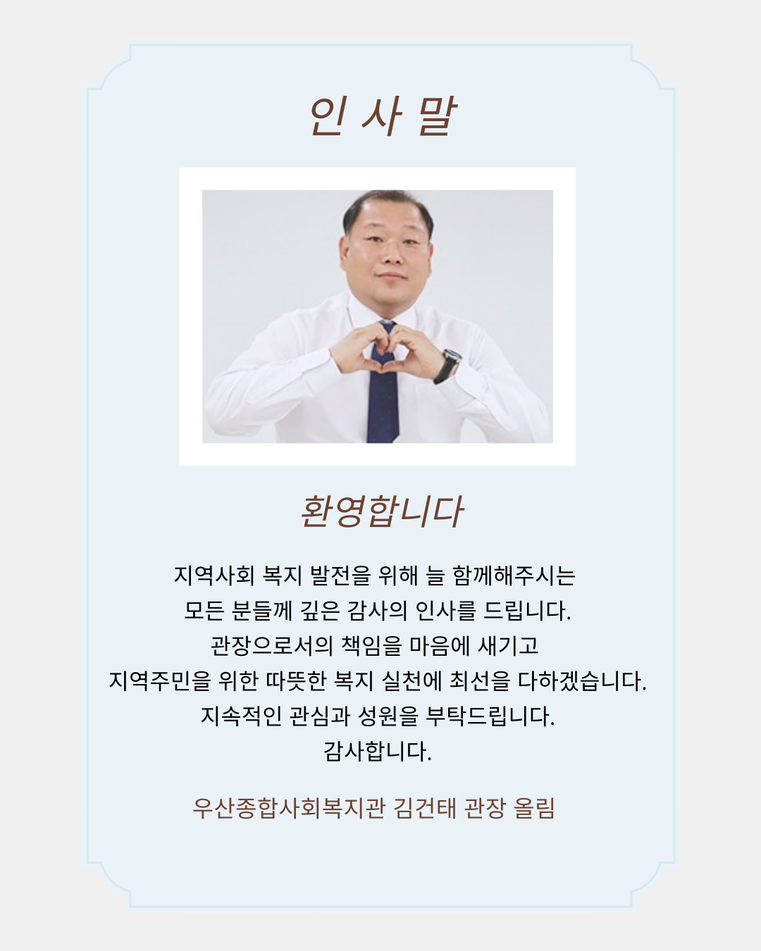 우산종합사회복지관은 김건태 관장님과 함께 주민 여러분의 일상에 더 깊이 다가가고, 누구도 소외되지 않는 따뜻한 마을 공동체를 일구어 나가겠습니다.