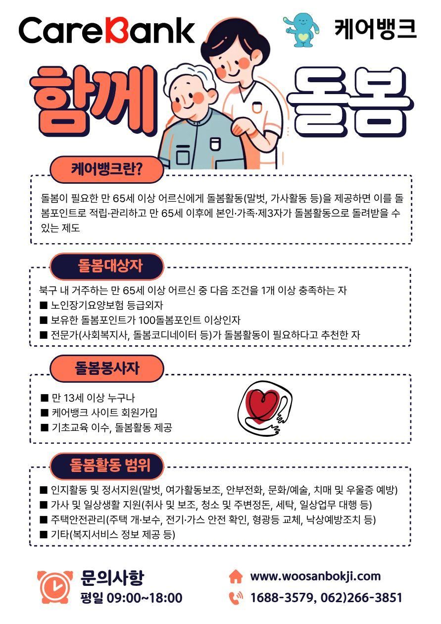 - 우산종합사회복지관에서는 2026년 케어뱅크 돌봄사업을 운영합니다.
