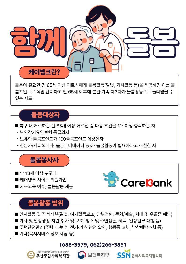 - 우산종합사회복지관에서는 2026년 케어뱅크 돌봄사업을 운영합니다.