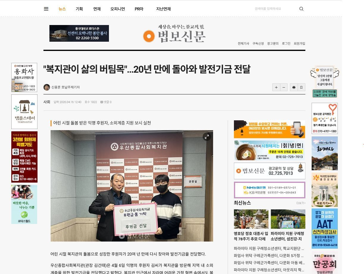 2026. 4. 16. 법보신문_"복지관이 삶의 버팀목"...20년 만에 돌아와 발전기금 전달