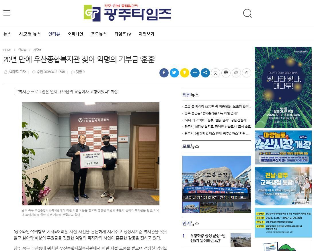 작성일 : 2026년 04월 16일제목 : 2026. 4 .13. 광주타임즈_20년 만에 우산종합사회복지관 찾아 익명의 기부금 '훈훈'